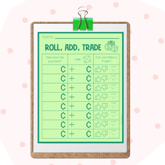 Using the game Roll, Add, Trade, students will roll a die to collect the correct amount of pennies. When they have enough, they will trade their pennies for the equivalent amount. Students can use their equivalent amount anchor chart to reference throughout the game.