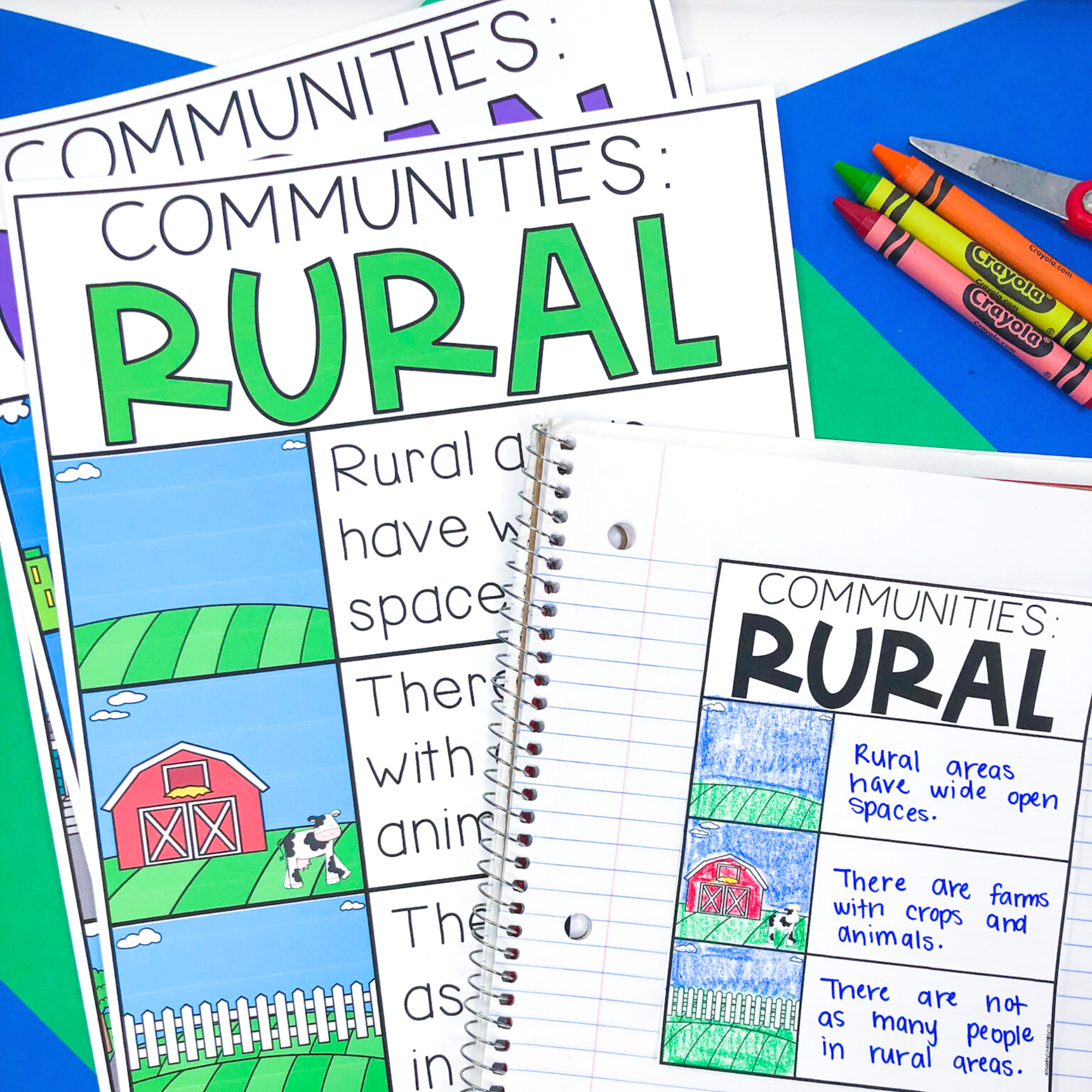 Display the rural community anchor chart to teach the characteristics of rural communities.